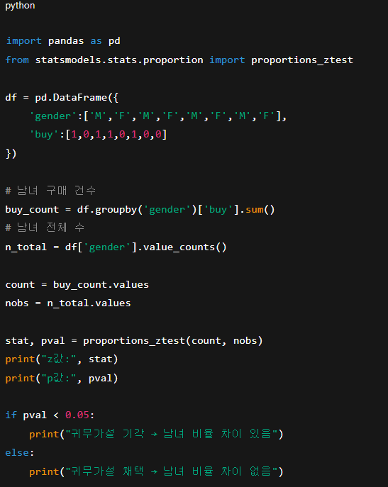📌 예시 문제 4 — 두 분포 비율 차이 검정(두 비율 z-test)