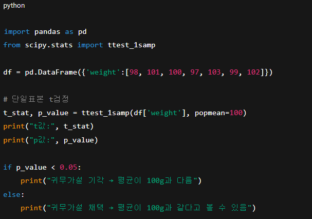 📌 예시 문제 3 — 평균이 기준값과 다른지 (단일 표본 t검정)